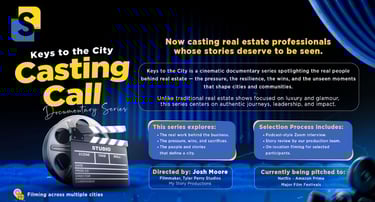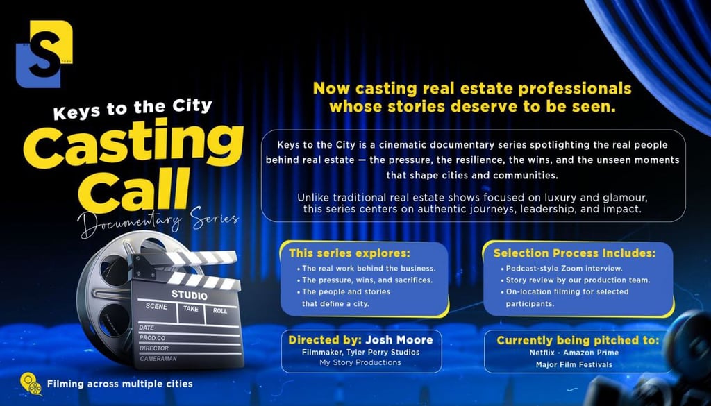 Keys to the City is a cinematic real estate docu-series created by the My Story Productions, led by filmmaker Josh Moore, whose background includes 10 years at Tyler Perry Studios. The series uncovers the real stories behind real estate—beyond the luxury homes and social media glamor. Through on-location filming, documentary-style interviews, and raw storytelling, the show highlights the grit, heart, and resilience that realtors live through every day. From deals that fall apart to the emotional wins no one sees, Keys to the City gives viewers an inside look into the people who shape their cities, one closing at a time. We'll be pitching the series to Netflix, Amazon Prime and several film festivals.